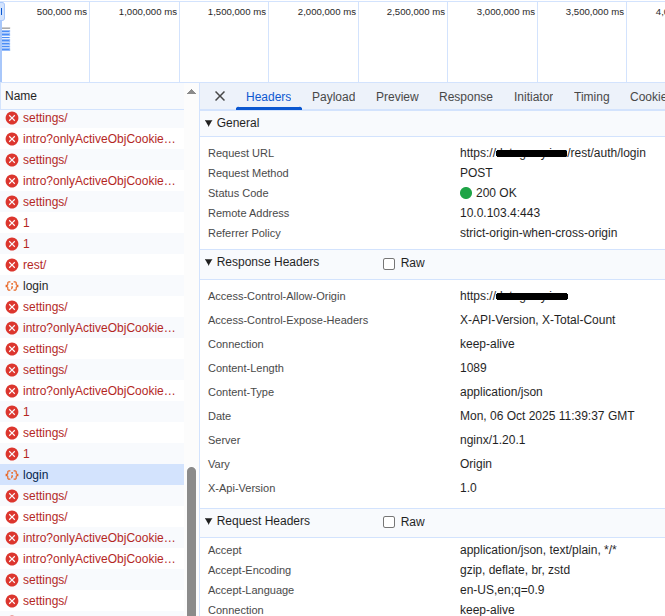 The whole thing is stranger than it seems. I have two different browsers on the same computer, and one works fine. In the other browser(chromium), the login succeeds, but subsequent queries aren’t being directed to the standard port 443. Instead, they’re going to port 4000.